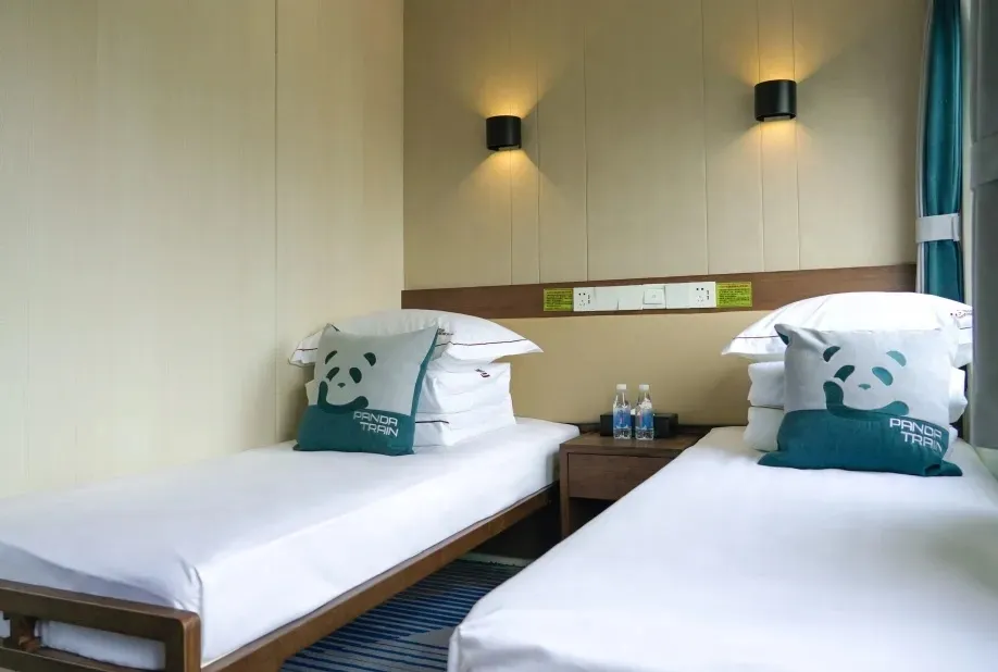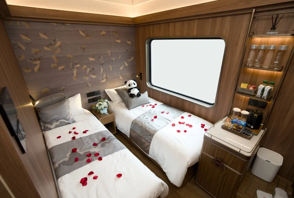 The body of the "Panda Special Train" adopts the overall painting, and the interior and exterior decoration of the whole train is designed in accordance with the theme elements of "Panda". The train has a total of 12 carriages, including 10 theme carriages composed of 1 super soft sleeper, 2 high-class soft sleeper, 5 high-class hard sleeper, 1 dining car, 1 multi-purpose entertainment carriage, 1 camping carriage and 1 electric carriage, with a seating capacity of 252 seats. In terms of hardware equipment, "Panda Special Train" is equipped with such humanized service facilities as safe and intelligent electronic locks, intelligent service system, long viewing table, song ordering, audio-visual entertainment, USB charging device and constant temperature shower system compared with ordinary tourist trains.