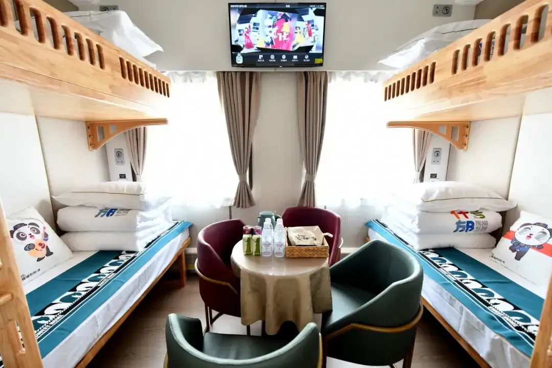 The new model of the Shifang "Panda Special Train" incorporates colors from the bronze standing figure of Sanxingdui, along with graphics of the ancient Shu origin, "Panda Special Train" badges, and exclusive Shifang logos. It also increases the number of premium soft sleeper and premium hard sleeper carriages, which have received positive feedback from passengers. The train's fire safety and noise reduction facilities have been optimized and upgraded, and the intelligent facilities and equipment in the compartments and shower rooms have been rationally renovated to provide a better passenger experience.